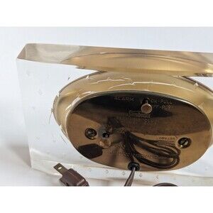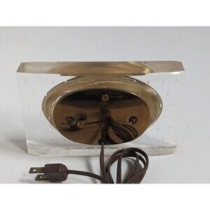 The clock runs, but the alarm does not appear to function. There are internal stress cracks in the lucite around the clock insert and some typical age-related wear to the gold-tone back plate. The lucite shows light surface scratches on the top and bottom consistent with age. The cord remains flexible and intact. Despite the cracks, the clock displays beautifully and is ready to add elegance to any space. Please see photos for condition details and ask with any questions. Thank you!