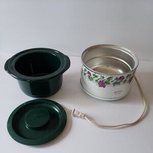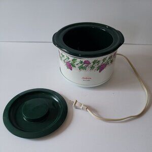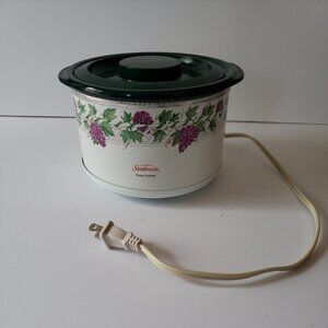 Pre-owned vintage Sunbeam Mini Slow Cooker, model SC100, featuring a rare grape vine and ivy design. Compact size perfect for dips, sauces, small meals, or personal servings. Tested and works perfectly. Great collectible or everyday functional piece for retro kitchen lovers.