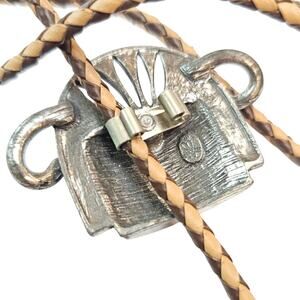 This vintage bolo tie, crafted by Suncrest, features a Southwestern-inspired design. The braided leather cord measures 34 inches from tip to tip, offering a comfortable length for wearing. Circa 1970s.
