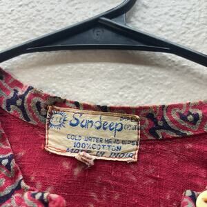 Authentic late 1960s to early 1970s Sundeep India boho maxi crafted from soft 100% cotton hand block print fabric with a hippie folk floral pattern and artisan ethnic detailing. Features a button front, balloon peasant sleeves, and free-flowing prairie silhouette with bohemian vintage festival vibes. Beautiful cottagecore gypsy aesthetic with Woodstock-era Indian import style, perfect for retro collectors, free people lovers, and 70s fashion enthusiasts. Made in India.