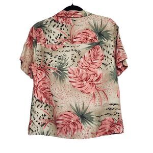 Vintage Sunset Cove pink green & tan palm print button up collared Tropical Island Hawaiian shirt in great condition 40" bust 23" long