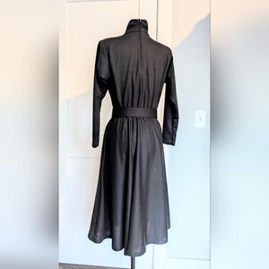 Vintage Sunshine Starshine black high neck dress with original belt, flared skirt, and original shoulder pads. Very classic and feminine style. Could also work for a witchy or whimsigoth aesthetic as well.