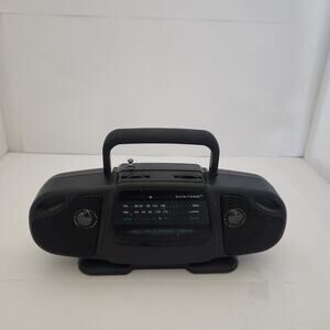 Portable, runs off of batteries. Features antenna and carrying handle.