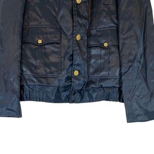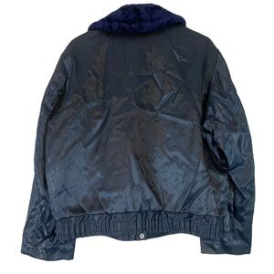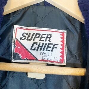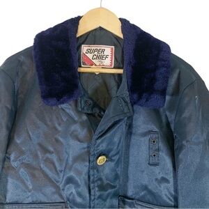 Vintage Super Chief Aviator Military Bomber Jacket Navy Size L/XL. Nylon blended outer. Minimally insulated. Hidden elastic cuffs. Front pockets. Faux fur collar. Double front zip zip and button closure.