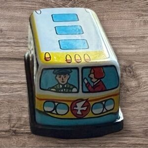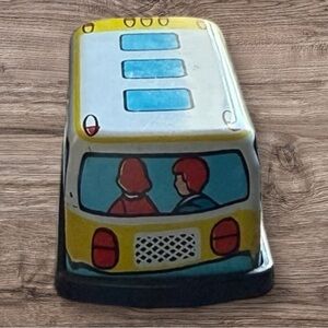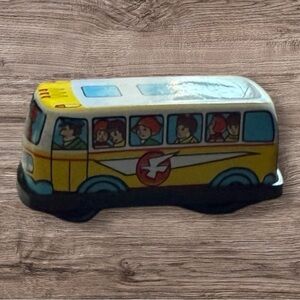 Fun vintage miniature lithograph tin toy measuring only 2" long and 7/8” tall in size. Featuring a tour bus filled with passengers with lady acting as guide, it bears a stylized flying bird on each side. It is complete with a continuous plastic bumper, working wheels and JAPAN stamped on the underside.