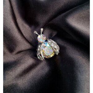 This is a vintage WEISS brooch shaped like a sparkling winged insect or bug, crafted with dazzling aurora borealis (AB) rhinestones that catch the light beautifully. Set in rhodium-plated metal, it has a bright, silver-like shine and is signed "WEISS" on the back. The brooch is in excellent vintage condition with only minor wear from age, adding to its charm. Measuring 1 1/4 inches by 1 inch.