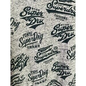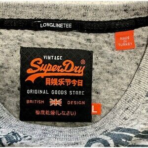 Vintage Superdry T Shirt Mens Large Long Line Gray All Over Graphic Logo
