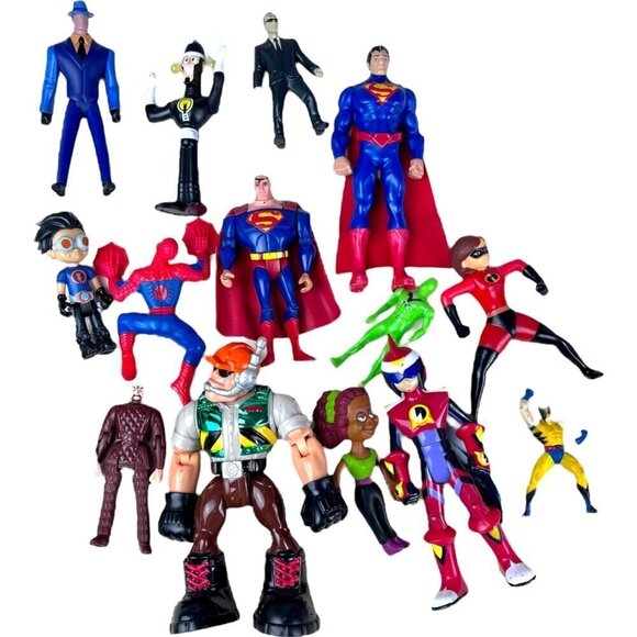 Vintage action figure lot featuring 13 iconic Justice League, Marvel, and Incredibles superheroes. Includes bendable figures, perfect for collectors and enthusiasts.