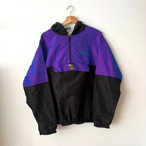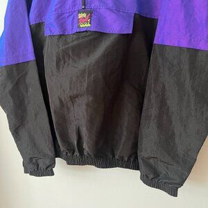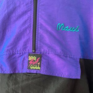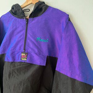 Vintage Surf Style Maui Pullover Anorak Windbreaker Jacket Made in USA- Adult One Size. Purple/black, Maui detail on back/chest, pullover 1/2 zip style, front pocket, nylon blend. In good condition.