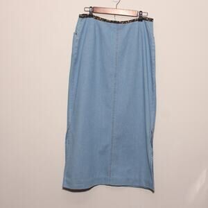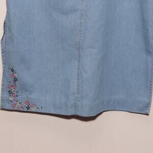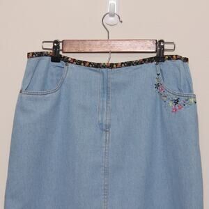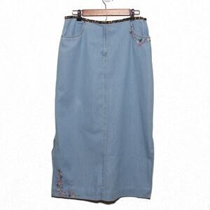 Vintage Susan Bristol Cotton lightweight Denim Chambray (not sure which) Maxi Skirt Size 10. Narrow floral accent waistband. Darts in back for shaping. embroidered flower accents with pearl centers at pocket and hemline.