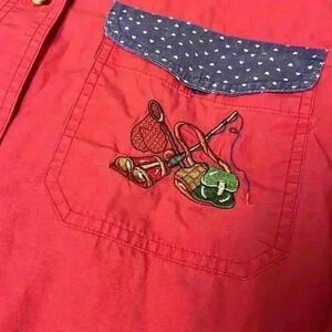Size 10. Front pocket is embroidered with adorable fishing gear. The pocket is blue denim with with tiny hearts. Sleeves are a stretchy cuff sleeve.