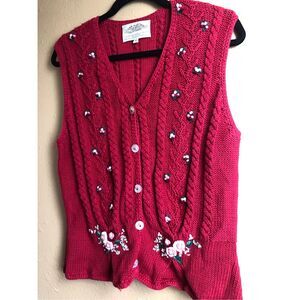 vintage sweater vest, Susan Bristol vest, 1990s knit vest, hand embroidered vest, floral sweater vest, red cable knit vest, ramie cotton vest, cottagecore sweater vest, grannycore style, preppy vintage top, boho knit vest, retro embroidered sweater, 90s Susan Bristol New Traditions, floral embroidery, vintage women’s clothing, classic knitwear, button front vest, romantic vintage style, embroidered floral vest, medium size vest