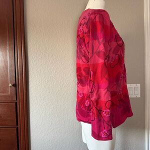 This vintage embroidered sweater by Susan Bristol features vibrant red and pink hues with a striking floral design. The V-neckline and long sleeves add a touch of elegance, making it a versatile addition to your wardrobe.
