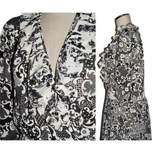 Lovely 80s era Susan Freis (sister company to Diane Freis) poly georgette midi dress with abstract floral and paisley white on black pattern. Top is low cut, blouson has ties at neckline. Skirt is full with inserts of knife pleats in contrasting black on white pattern. Ruffle collar is contrasting in same black on white pattern. No shoulder pads, fabric is light and flowy.