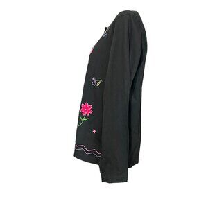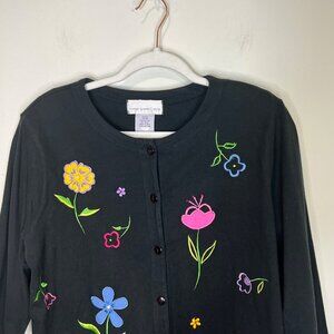 Vintage Susan Graver Style Black Floral Embroidered Button Front Cardigan