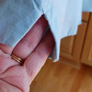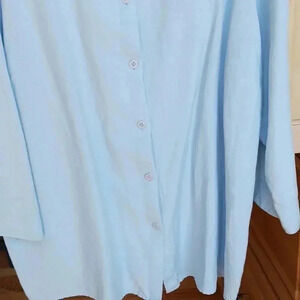 this is a 3/4 sleeve linen top that is very comfortable for summer wear. it will need to be ironed to look its best after washing. it has a Raglan sleeve, and it has darts at the bust. measurements pit to pit are 24 in. and it is 28 inches in length.