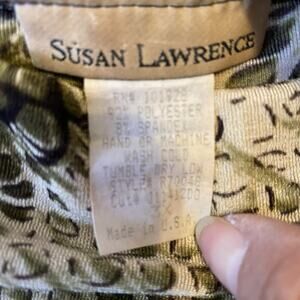 This is a vintage Susan Lawrence T-shirt made in the USA with a jersey knit fabric. The shirt has a V-neckline and short casual sleeves, and it features a colorful animal print with a snacking theme. The shirt is a size 3X, and it has a regular fit for plus-size women. It is made of a polyester and spandex blend, and it has stretch and machine washable features. The shirt is perfect for travel, casual wear, or workwear, and it can be worn during the summer, fall, or spring seasons.