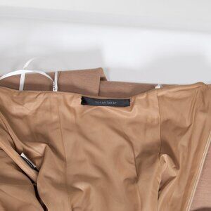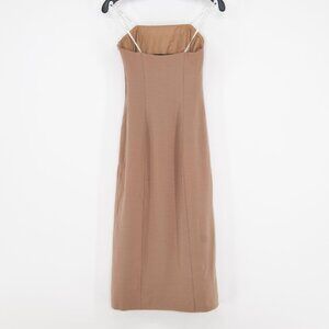 Early-era Susan Lazar minimalist strapless maxi dress in a camel merino-blend. Clean column cut with internal hanger straps (not meant to be worn), fully lined, Made in USA. Elegant and refined for evening or special occasions.