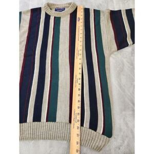 Made of 100% acrylic, this machine-washable sweater is designed for regular fit and is available in size M. Its multicolor stripes add a touch of style, making it suitable for winter, summer, fall, and spring. This pullover sweater with accents of comfort and vintage feels is a must-have for any fashion-conscious man. Excellent condition measurements are in the pictures