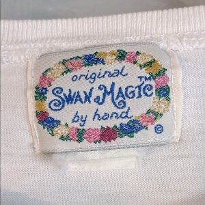 Unique and rare, this vintage Swan Magic embroidered T-shirt features a beautiful tone-on-tone floral raised embroidery design across the front. Soft and lightweight, it combines the comfort of a classic tee with the elegance of hand-done detailing.