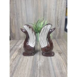 Vintage Swan Vases, Brown Drip MCM Art Deco 8-1/4" Redware Pottery