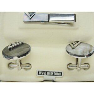 Vintage Swank MOP Round Set Silver Tone Cufflinks & Tie Clip Tux Shirt Suit