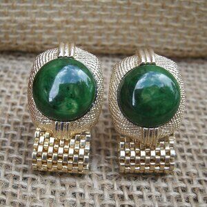 Vintage tie tack and cufflink set made by Swank. Goldtone metal with green swirl sets. Tie tack has chain and bar. Cufflinks are 1 inch front to back, 1 1/4 inches high, 1/2 inch wide. Tie tack is 1/2 inch by 3/8 inch, 5/8 inch front to back. Marked "Swank" on the backs. Good condition. Finish good, sets intact. Great for anyone who likes vintage tie tacks and cufflinks. Great for many occasions.