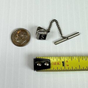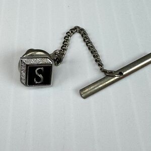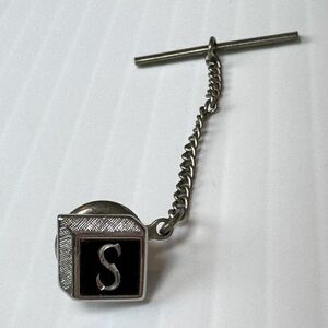 This vintage Swank tie tack features a square shape with a silver tone and an initial letter S. The tie pin is a perfect addition for any collection, and its vintage style makes it a great conversation starter with a letter S initial.