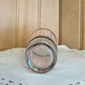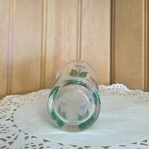 This set of vintage small glasses feature unique designs including floral patterns and geometric accents. Ideal for serving juice or to add to a collection. Set includes four glasses: solid pink, pink and black geometric, blue green floral, blue tulips. Each glass holds approximately 3 fluid ounces.