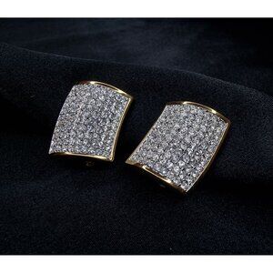 These dazzling Swarovski signed earrings from the 1990s capture the unmistakable sparkle and precision that made the brand an icon of luxury. Each earring features a curved square design, entirely encrusted with brilliant pave-set crystals that shimmer like fine diamonds. The crystals are framed in a polished gold-tone setting, offering a striking balance between geometric sophistication and radiant glamour.
