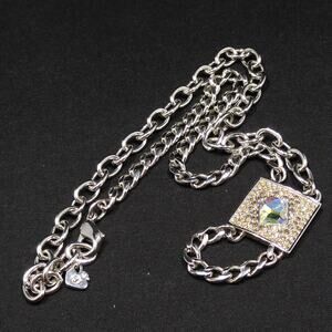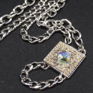 This is a stunning vintage Swarovski necklace featuring a radiant Aurora Borealis crystal set in a square pendant design from the late 1990s to early 2000s. The pendant sparkles with a central faceted AB rhinestone surrounded by tiny pavé crystal accents, all on a high-shine rhodium-plated chain that resists tarnish beautifully.