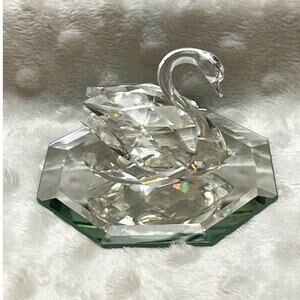 Vintage Swarovski Beauties of the Lake Crystal Swan (Medium)w/Mirror-Retired. Beautiful crystal piece, delicate cut, reflective with multi-colors with light, & octagon shaped mirror. Introduction date by Swarovski 1977, now retired, hard to find medium swan. Measures 1 3/4" tall, 2" side to side at widest point, & 1 1/4" wide. Swan in mint condition, stamped on bottom, no cracks or chips, beautifully displayed. Mirror in great condition, little to no wear along edges. Comes from smoke free, pet free home.