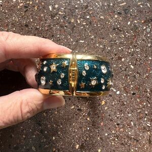 This Vintage Swarovski bangle bracelet features celestial stars and a moon design in blue enamel, accented with sparkling crystal stones in white. The bangle style adds a trendy touch to the piece, while the multicolor design makes it versatile for various outfits and occasions. Made with high-quality materials, this bracelet is a stylish and elegant accessory to elevate any look.