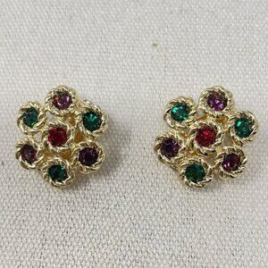 Vintage Swarovski Gold Tone Clip-On Earrings Red Green Crystals Classic Elegant