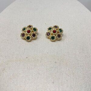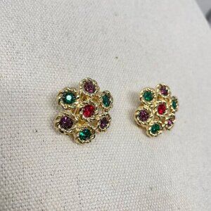 These vintage clip-on earrings feature a stunning gold tone with vibrant red and green Swarovski crystals. Ideal for adding a touch of elegance.