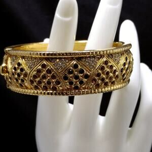 *Description: This is a beautiful Swarovski hinged bracelet with rhinestones in three colors: clear, black, and topaz, from the late 1980s. The bracelet is gorgeous. Note: The flaws are that there are 14 tiny rhinestones missing; seven topaz and seven black. All the clear rhinestones are in place. The missing rhinestones could be replaced or the bracelet worn as is. You do not notice the missing stones at a glance. The hinge fits snug. The bracelet has the swan logo for Swarovski on the inside. This would be a great addition to your vintage jewelry collection or make a great vintage gift!