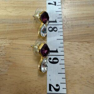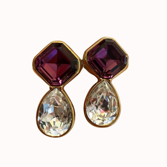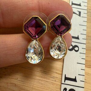 Elegant Swarovski S.A.L. earrings featuring gold-tone metal with intricate faceted purple square and clear teardrop crystals, adding sophistication to any jewelry collection.