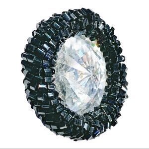 Fabulous earrings hand crafted by Lisa Jo Silberkleit of Sonoma. These new old stock earrings have large Swarovski Crystal Rivoli surrounded by beautiful jet black glass beads, fabulous , suede back , pierced. Elegant and beautiful. Will come with artist statement, they measure 1” in diameter.Please see all photos for full description.