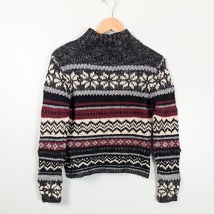 Vintage 90s fair isle snowflake pullover sweater from Sonoma, size small. Mock neck. Cream, black, gray, and maroon red colorway. Ideal for preppy, classic, heritage, striped, holiday, and apres ski vibes. Perfect for fall, winter, business casual, layering, and everyday.