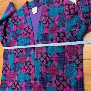vintage, sweater jacket, open front, paisley, diamond, check, teal, sweater blazer, 70s, 80s, funky, groovy