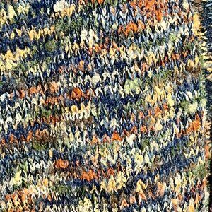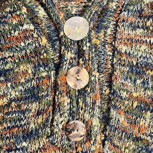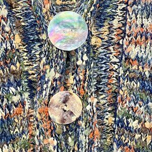 Muted earth tones, colorful. Mother of pearl large buttons.