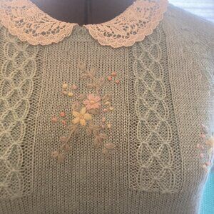 Beautiful vintage mid-length, long sleeve pale turquoise (aqua?) sweater dress by Plain Jane for Espirit with hand embroidered floral pattern on front bodice and top of sleeves, lace collar and ribbed inset waist. Marked Size S, but fits closer to an XS. Dress form is set to 33"x25"x34" and dress fits well on form. Skirt is 25" from bottom of ribbing to hem. 75% acrylic, 25% nylon. Hand wash
