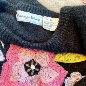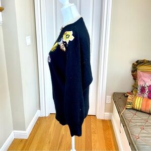 Beautiful black batwing sleeve sweater, vintage, embroidered and beaded multi colored floral pattern, pink yellow purple, Carriage Court