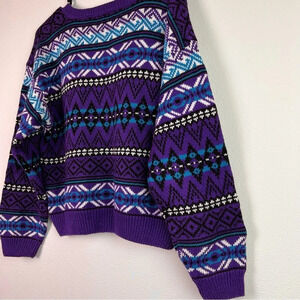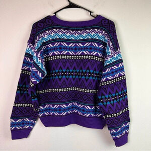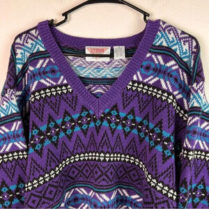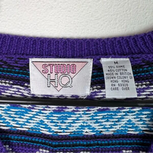 Vintage Sweater Geometric Print V Neck Size Medium Studio HQ Purple Blue White