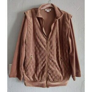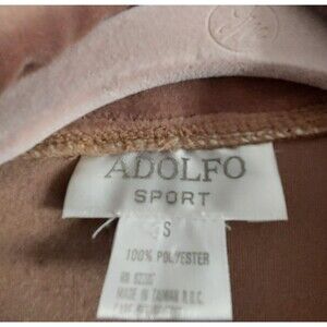 Vintage womens jacket by Adolfo Sport , size Small, from the 1990s. Made of soft velvet polyester, shoulder pads, offering a smooth and elegant feel. Features a full front zipper, two side zip pockets, and a textured front panel. Measures 19 from armpit to armpit and 26.5 in length. A comfortable, versatile piece with a timeless look