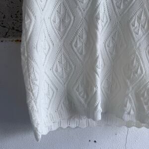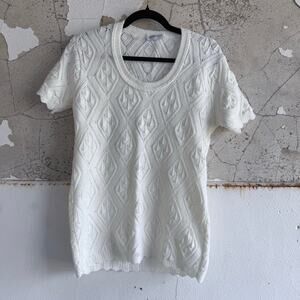 Vintage LeRoy Knitwear California short-sleeve sweater in clean winter white. Diamond pointelle pattern, soft scoop crew neckline, and pretty scalloped edges at cuffs and hem. Light-medium weight with that vintage, cloud-soft hand that layers over slips, tees, or under a blazer. Likely late 1960s–1970s based on the label and construction.