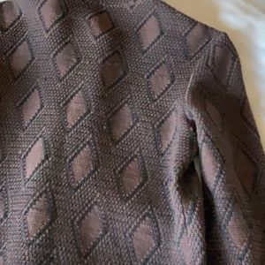 Beautiful fitted design sweater. with fringe edging. One pocket. Six button-down sweater. Semi Nehru collar. No tag it says it’s a size 6. Approximately 16 “across under arms, sleeve approximately 22 “ from shoulder, Shoulder to hem 22 1/2. All appropriate Has a couple different f snags. From 70’s.