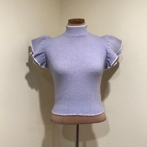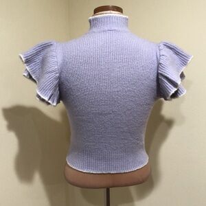 Excellent condition no stains rips or fading. Short sleeve, ruffle sleeve, high mock neck, cropped pullover sweater. No tags inside. Fits like small and is a soft, fuzzy and stretchy material like acrylic.
