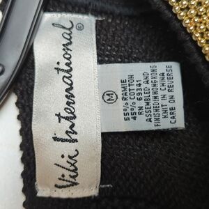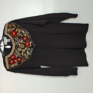 Black knit sweater with amazing black, red and gold beading and sequins that create a 3-D floral pattern. Attached shoulder pads. The left shoulder pad has come unstitched from the sweater on one side. It's probably a very easy fix, I'm just not handy with a needle and thread. The material is a ramie and cotton blend. A perfect way to add a bit of bling to your holiday outfit! Excellent vintage condition -- no stains, holes, or fraying. There is a bit of pilling along some of the seams and there are a few pulls in the knit near the back button (pictured). The brand is tough to read because of the script; please note the photo of the tag. Pit to pit measurement: 19 inches. Length shoulder to hem: 29 inches.
