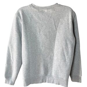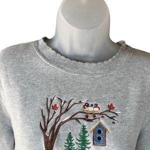 Charming Cottagecore 90s sweatshirt featuring embroidered birds and a winter scene. Designed with a scalloped crew neck collar for a unique feminine touch. Soft and cozy, perfect for layering with jeans or leggings. A nostalgic vintage find that blends comfort and style – ideal for the holiday and Christmas season.